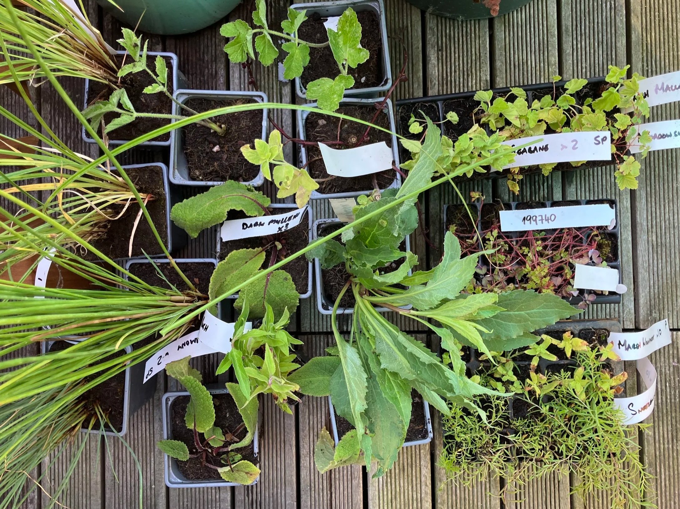 I’ve done a large planting. I ordered the plants from Naturescape, mostly plugs of plants that I’ve seen from our walks in nature. They include the native hogweed (Heracleum sphondylium) and the native golden rod (Solidago virgaurea), marsh woundwort (Stachys palustris), marsh mallow (Althaea officinalis), herb Robert (Geranium robertianum), meadowsweet (Filipendula ulmaria), hemp agrimony (Eupatorium cannabinum), lesser pond sedge (Carex acutiformis), hard rush (Juncus inflexus), sneezewort (Achillea ptarmica), and common fleabane (Pulicaria dysenterica). I then sprinkled seeds just about everywhere - campion, common poppy, and corn flower.