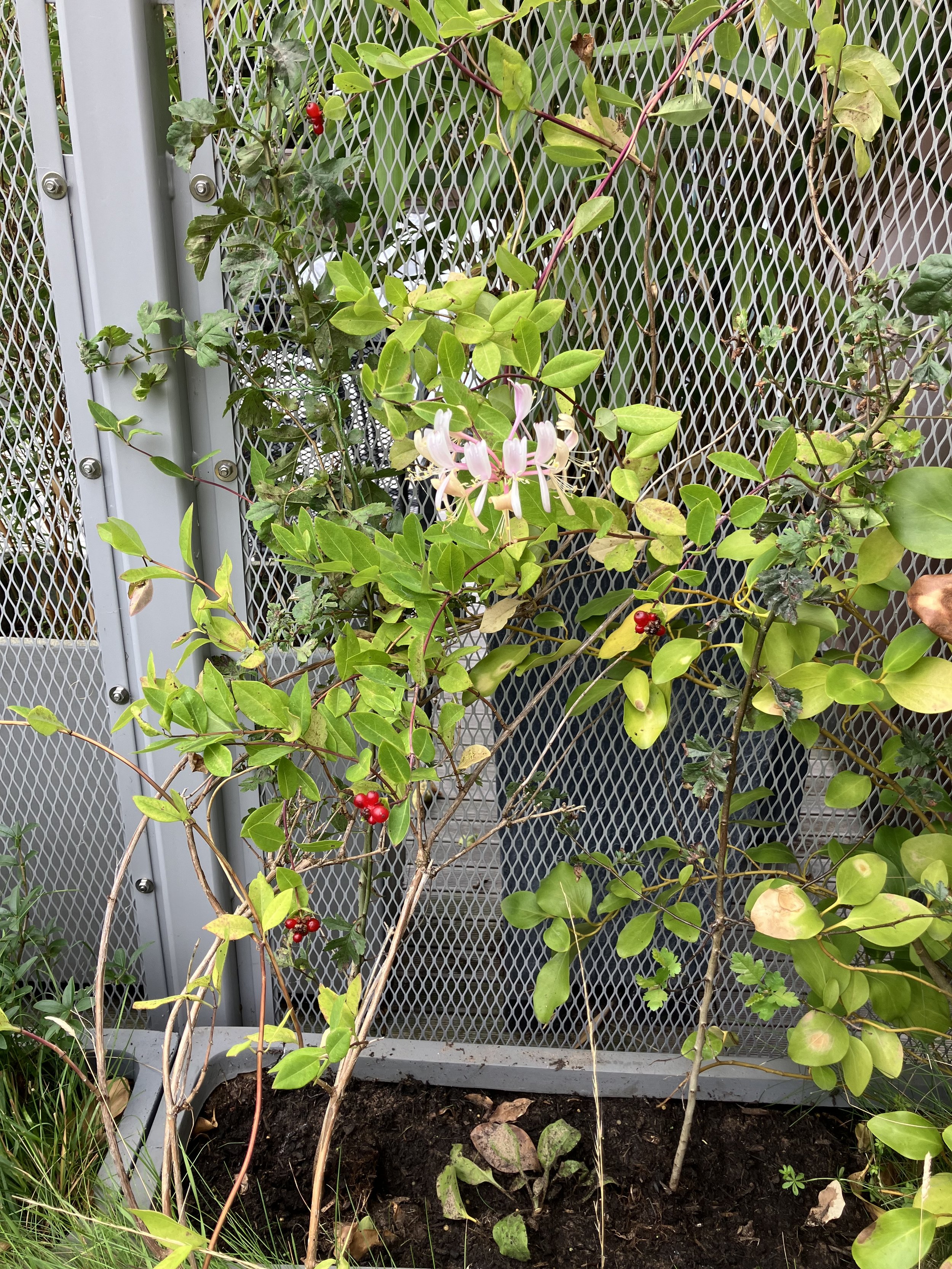 Two bedraggled hawthorn plants, with honeysuckle