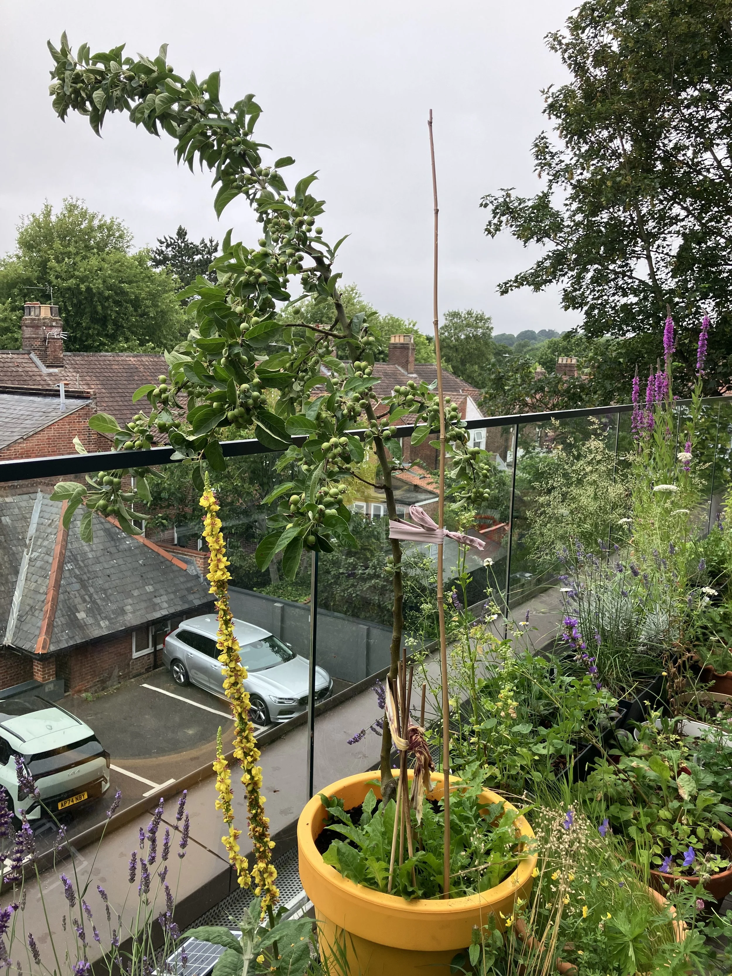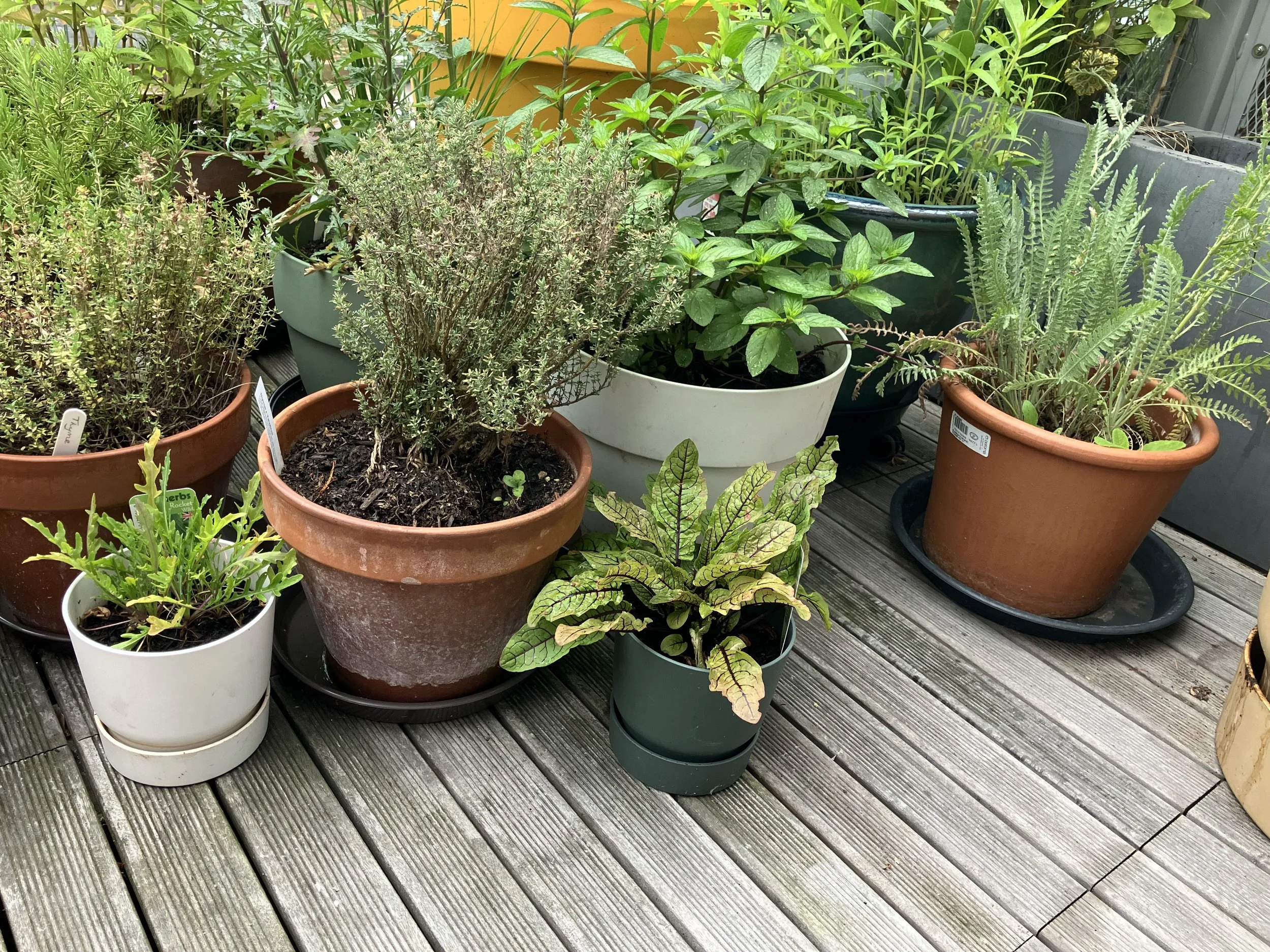 Around two-thirds of the pots we have are from the company, Elho. The pots are colorful and made from recycled plastic; and significantly, many of them have built in drainage systems i.e. areas below the pots where water can stand. It’s hard to know if this is a good thing, I’m nervous that the plants aren’t getting enough water and I’m also nervous that they’re getting too much.
