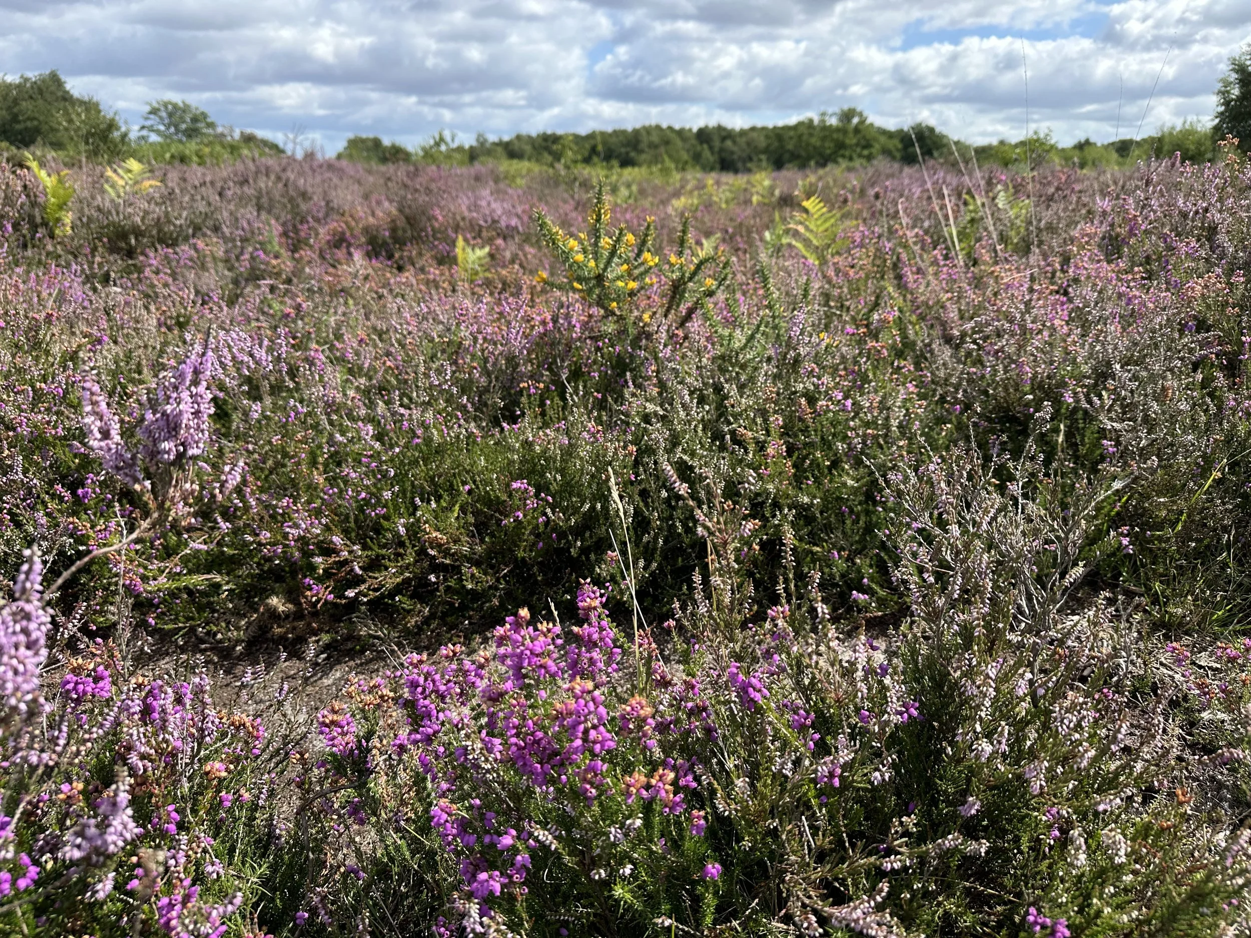 Here’s a photo from our walk today in Buxton Heath, Norfolk, dominated by common heather (Calluna vulgaris), bell heather (Erica cinerea), and common gorse (Ulex europaeus).