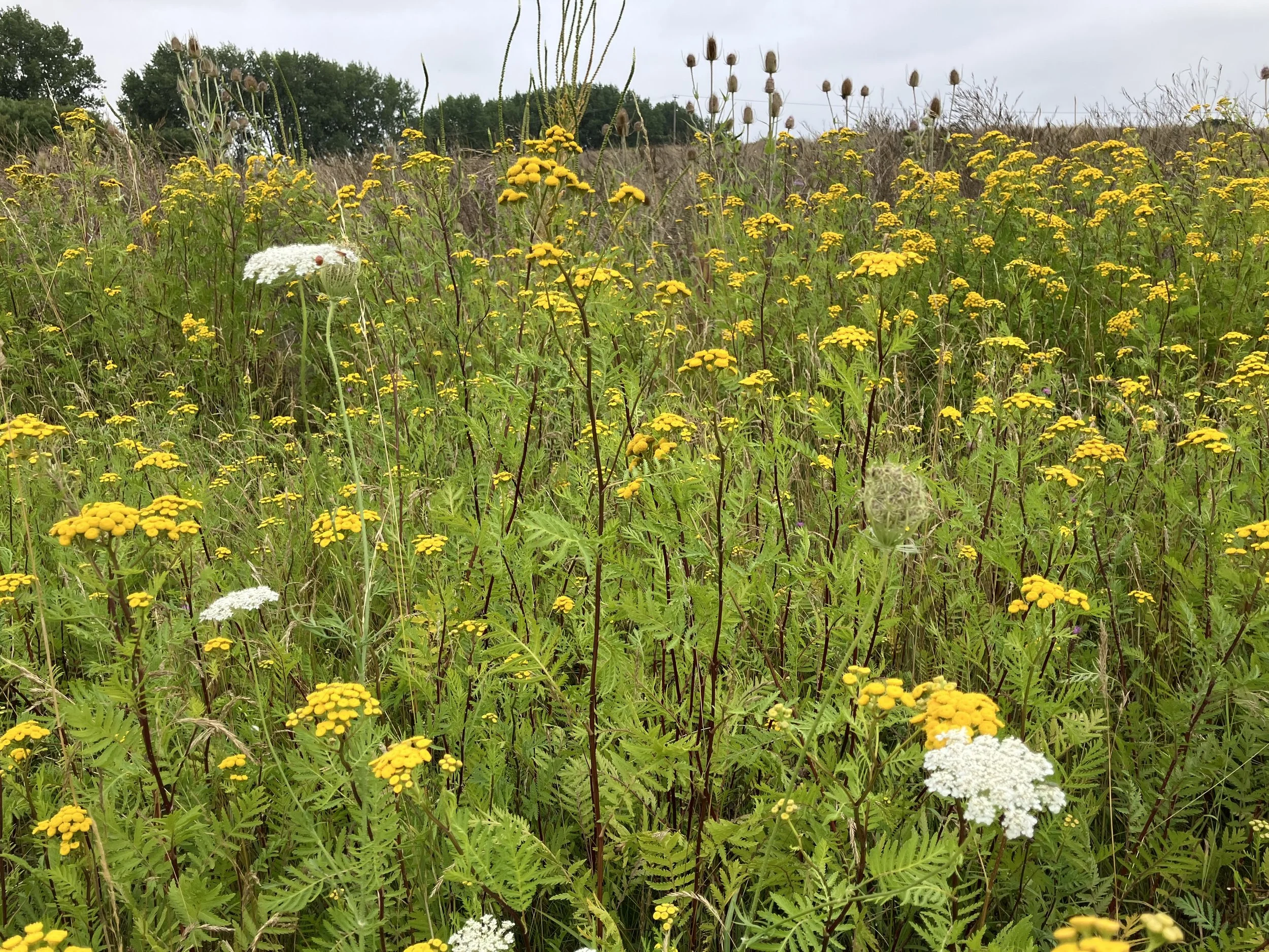One week earlier, here’s a field in Burnham Overy Staithe. The main plant is tansy (Tanacetum vulgare), there’s also meadowsweet. Not shown in the photo was common agrimony (Agrimonia eupatoria), the non-native greater burdock (Arctium lappa), and marsh mallow (Althaea officinalis).