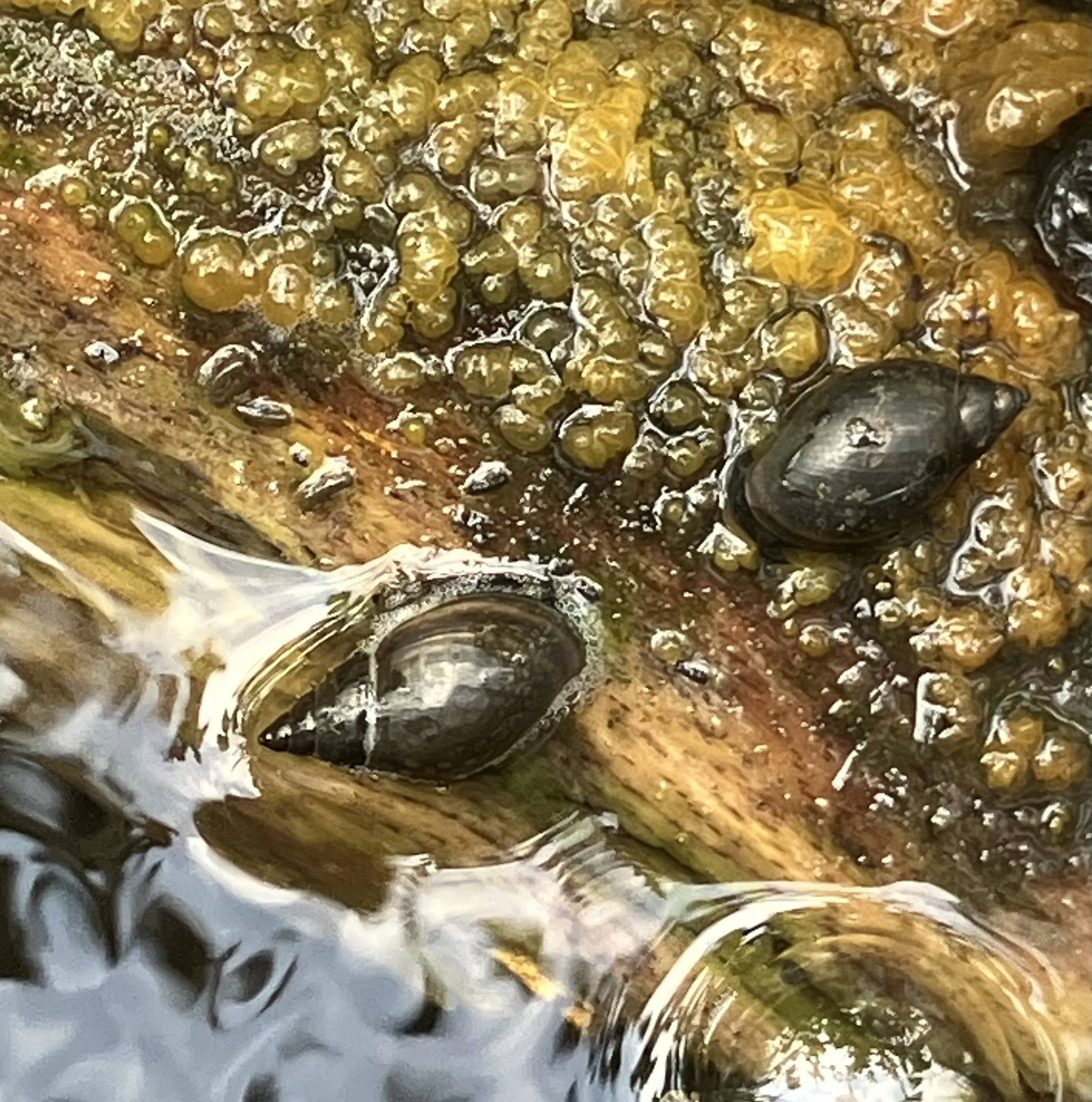 Slightly gross, but these are acute bladder snails. According to my internet search, they likely came with the pond plants that we purchased. The jury is out on whether it’s a good or bad thing that they’ve made it to our pond. They reproduce quickly (bad), but also keep ponds ‘clean’, whatever that means. They’re non native but naturalized. We thought that if they get out to control, we could get some fish or remove them by hand.