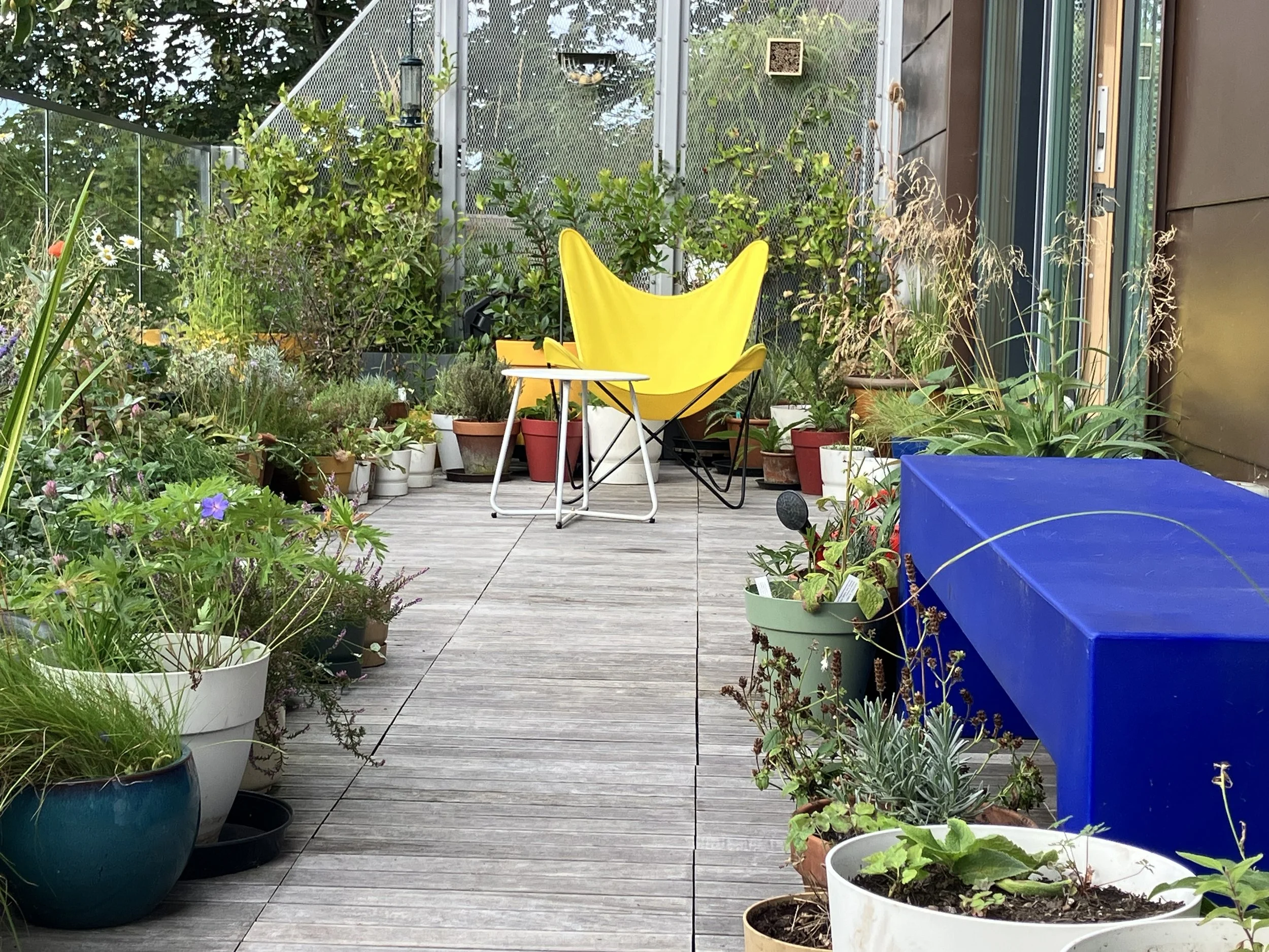 Pot to the left, rock sea lavender (Limonium binervosium), Deptford pink (Dianthus armenia), and marram grass (Ammophila arenaria). Pots to the right, front and back are rock cinquefoil (Potentilla rupestris).